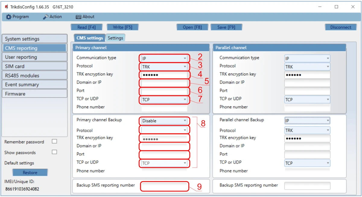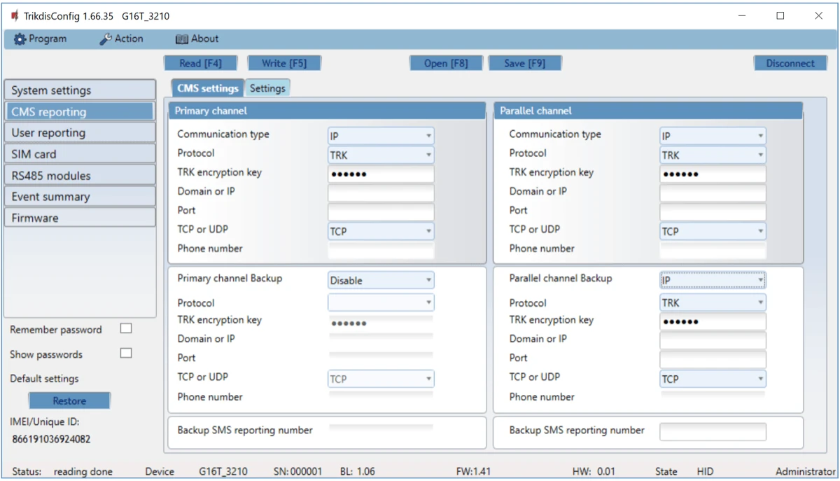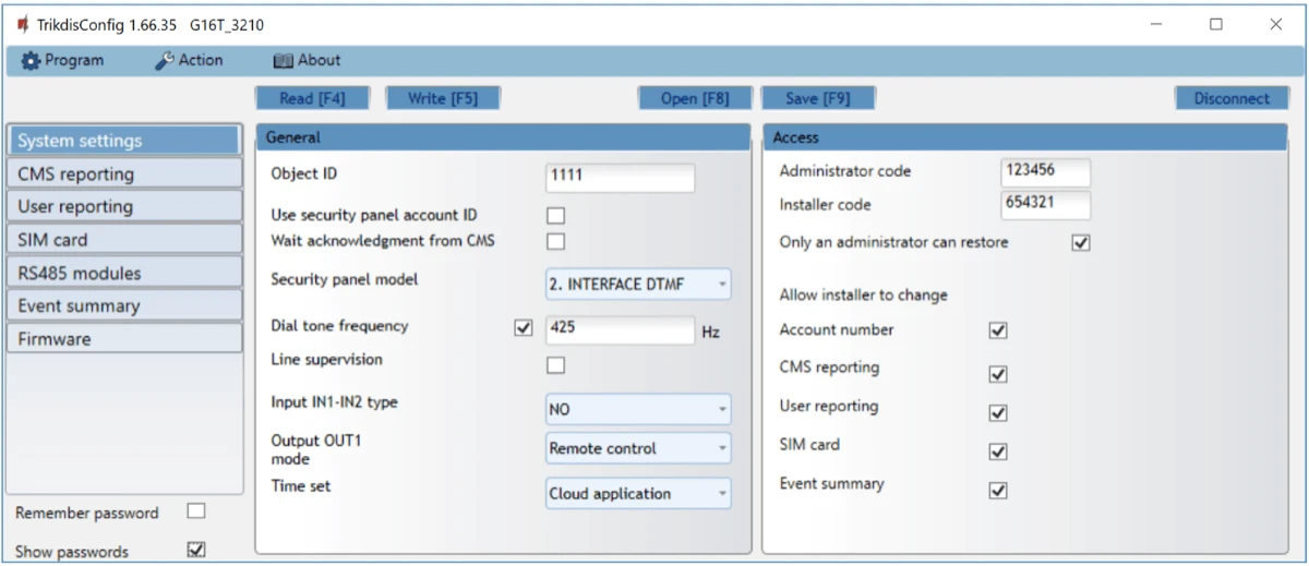 | Changing settings | With TrikdisConfig computer program remotely or locally via USB Mini-B port / Remotely with SMS messages |