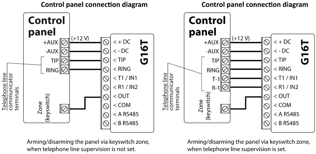 Cellular communicator G16T can be connected to any alarm panel that has a landline dialer and supports dialing in Contact ID protocol with DTMF tones.