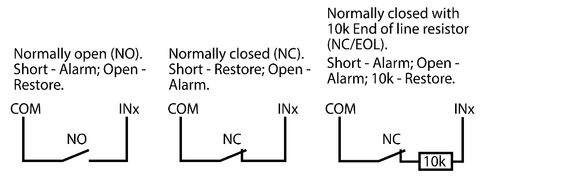 2 inputs, selectable type: NC; NO; NC/EOL; NO/EOL; NC/DEOL; NO/DEOL.