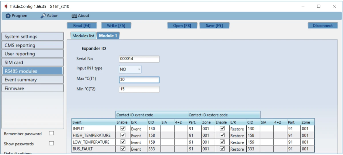 | T-1 / IN1 | Terminal for monitoring the telephone line or an input terminal, selectable type: NC; NO; NC/EOL; NO/EOL; NC/DEOL; NO/DEOL |