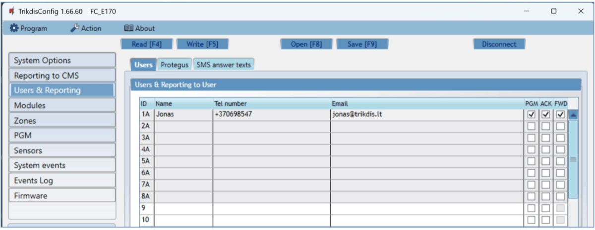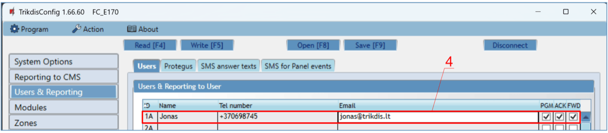 This tab will only be displayed if there is at least one user phone number in the “Users & Reporting” window. These settings can only be made for the first 8 users.