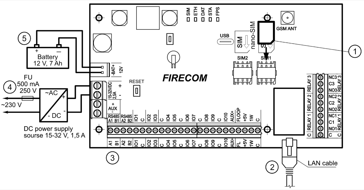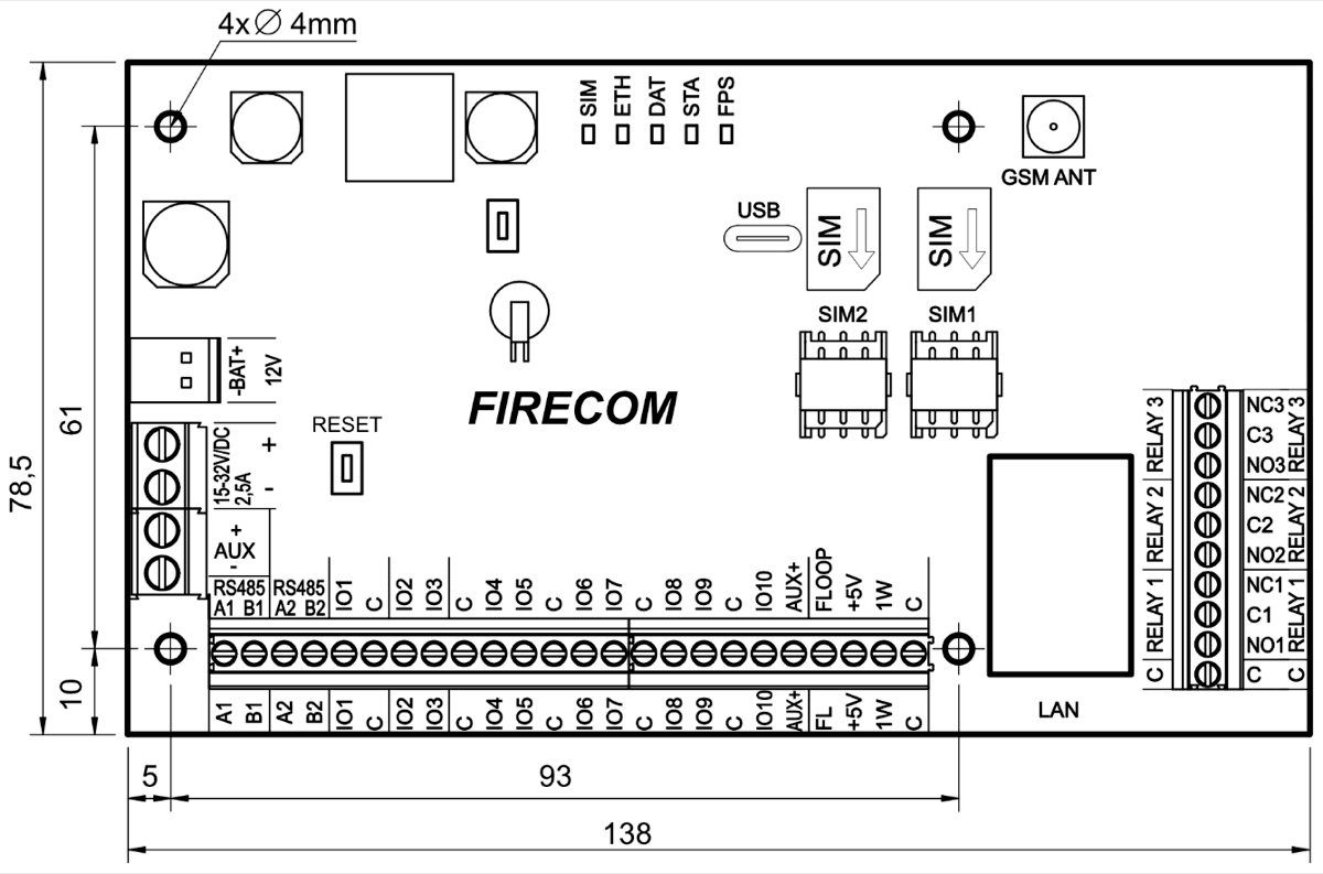 The FIRECOM is used for transmitting fire alarm control panel messages via LAN and/or cellular networks to the Central Monitoring Station’s receiver.
