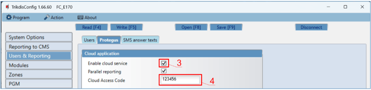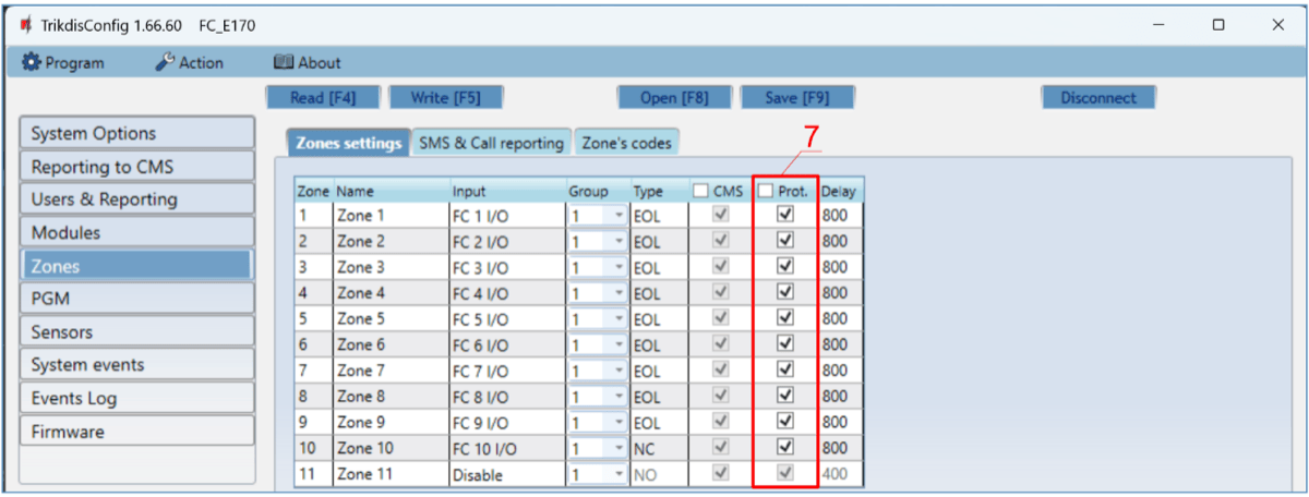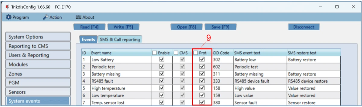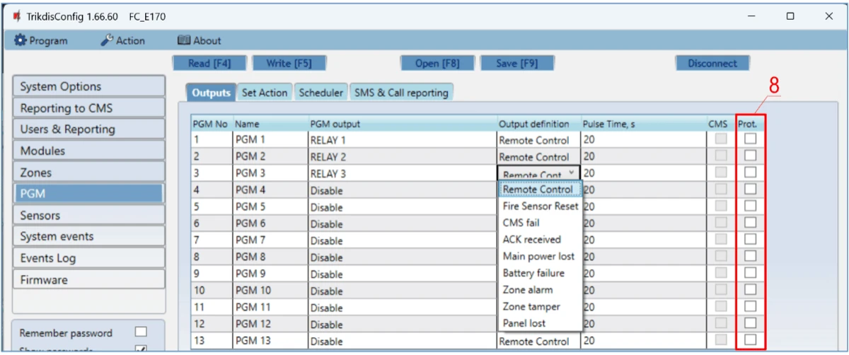 Prot. – if the box is ticked, output event notifications will be sent to Protegus2 app.