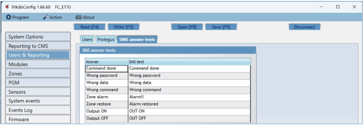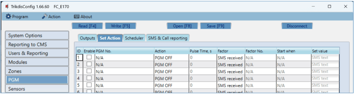 Set value – depending on the condition chosen in the “Factor” column a value (text of received SMS message) can be specified. If this value is identified, the action (chosen in the “Action” column) will be performed. The text of the SMS message can be separated by using % symbols. % symbols are used for separating the keyword that will change the state of a PGM output from the entire received SMS message.