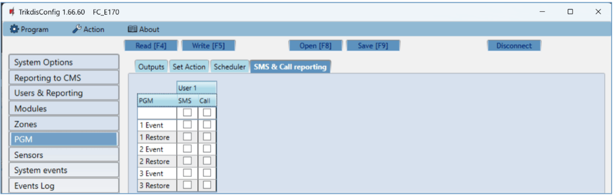 User SMS/Call – choose which users to inform via SMS message and/or call when an output OUT is turned on/off.