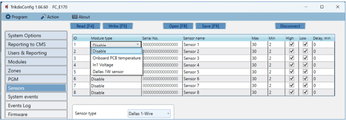 Sensor type – choose the type of the connected temperature sensor (Dallas 1Wire – up to 8 temperature sensors of this type can be connected. If Dallas sensors are chosen, they will be linked automatically; Humidity & Temperature – one AM2301 temperature and humidity sensor can be connected. If the Humidity & Temperature sensor will be used, it must be manually assigned in the “Module type” column).