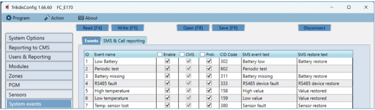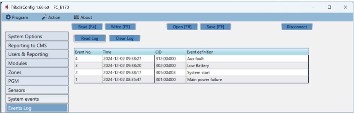 In the table, you can find the “Event No.”, “Time”, “CID” code, “Event definition”. The events log can show up to 1000 events stored in the FIRECOM’s memory.