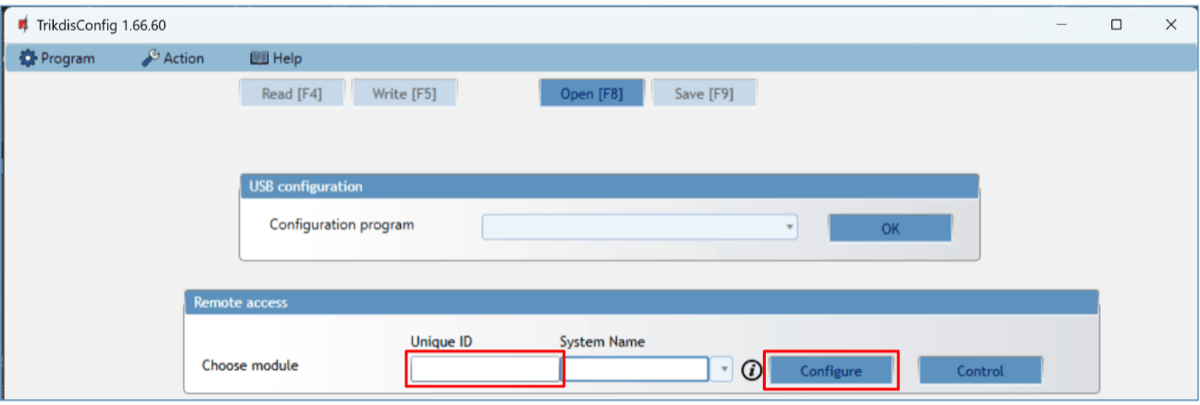 Device configuration either using an USB cable or remotely using TrikdisConfig software.