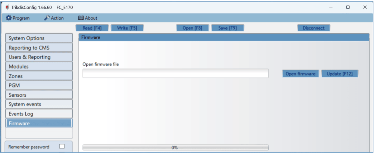 After connecting the communicator to TrikdisConfig, the program will automatically offer to update the firmware if any updates are available. Internet connection is needed for this feature. Antivirus software, firewall or strict internet access settings can block the automatic update feature. In this case, you will have to reconfigure your antivirus software. The communicator’s firmware can also be updated or changed manually. All prior settings of the communicator remain after an update. If the firmware is installed manually, it can be changed to a newer or an older version. Perform these steps: