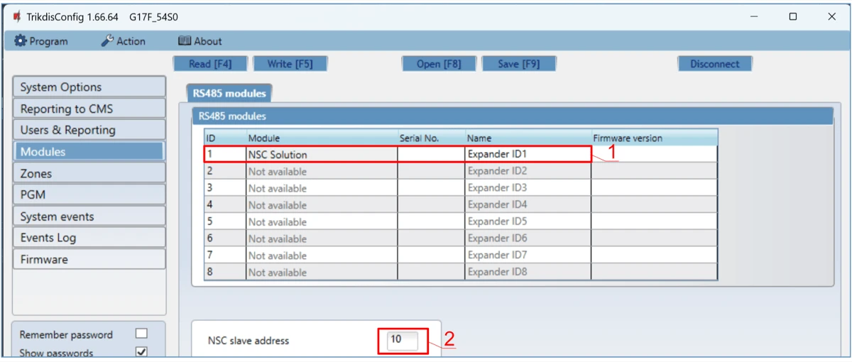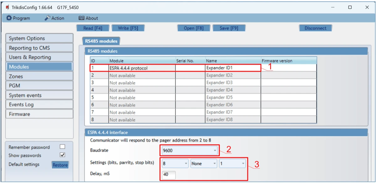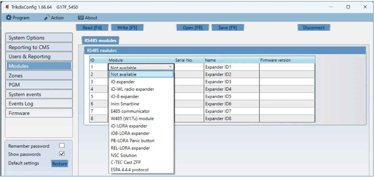 | Supported modules | iO – expander module; / iO-WL - iO-MO – iO-WL radio wave transceiver; / iO-8 - expander module; / E485 – „Ethernet“ module; / W485(W17u) – WiFi module; / iO-LORA – expander module; / iO8-LORA – expander module; / PB-LORA – panic button; / REL-LORA – expander module; / INIM Smartline - fire alarm control panel; / NSC Solution – fire alarm control panel; / C-TEC Cast ZFP – fire alarm control panel. / Fire alarm control panel with ESPA 4.4.4 protocol. |