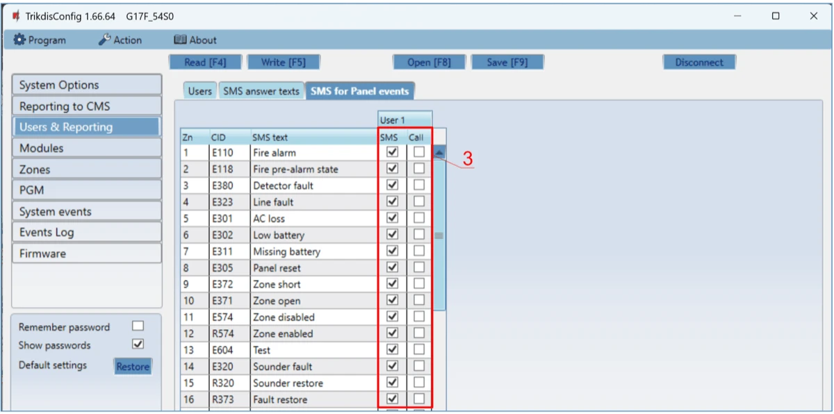 Use dial and SMS when working over internet module – checking the box will enable control of the communicator via call and SMS. If the field is unchecked and there is internet, then SMS and calls are not used. If the field is unchecked and there is no Internet, then G17F can manage call and SMS messages. G17F will send SMS messages to the user.