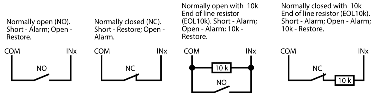 3 inputs, selectable type: NO, NC, EOL (4,7 kΩ, 10kΩ).