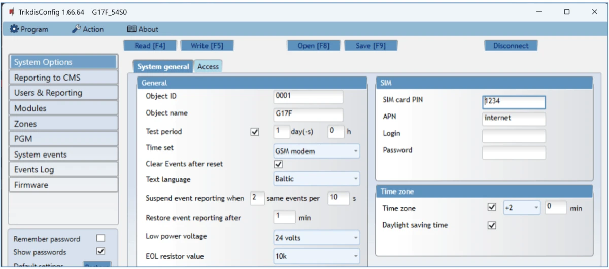 Disable indication of the absence of a SIM card – checking the box will disable the indication of the absence of the SIM card in the G17F controller.