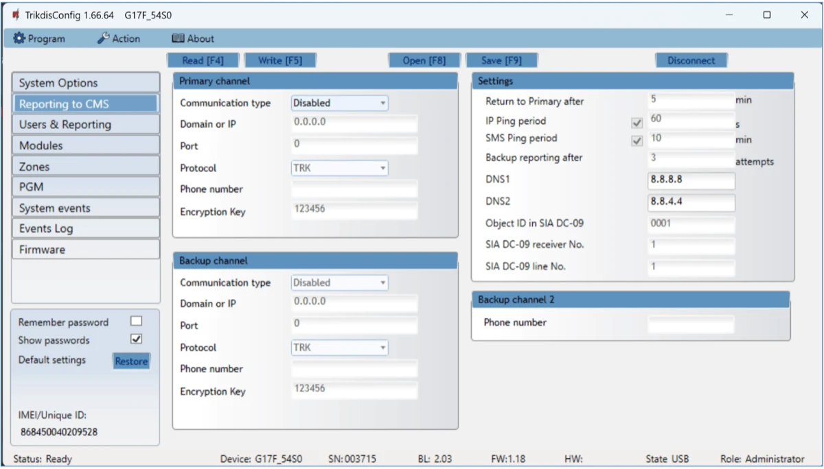 To test an input of the communicator, enable it. Check if the events were received by the Central Monitoring Station (CMS) and/or Protegus2 application.