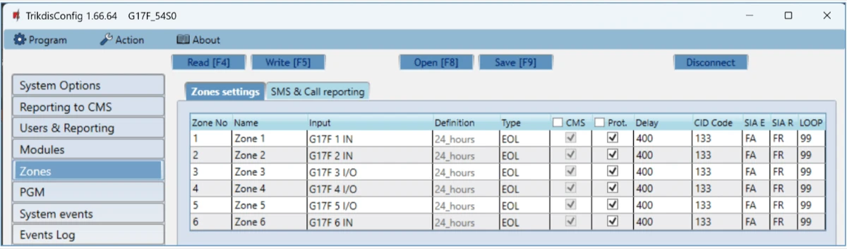 CMS – if the box is ticked, messages about zone events will be sent to the CMS (central monitoring station).
