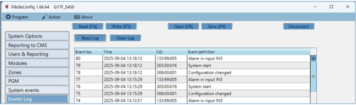 In the table, you can find the Event No., Time, CID code, Event definition. The events log can show up to 1000 events stored in the G17F’s memory.