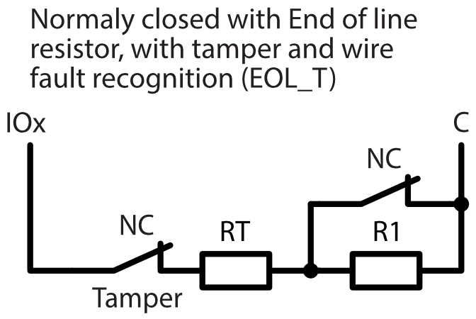 Inputs and outputs: - 8 I/O terminals, each one can be set as an input (IN) or output (OUT). Input (IN) types: ATZ, EOL, NC, NO. Different value of resistors can be used in EOL and ATZ type circuits.