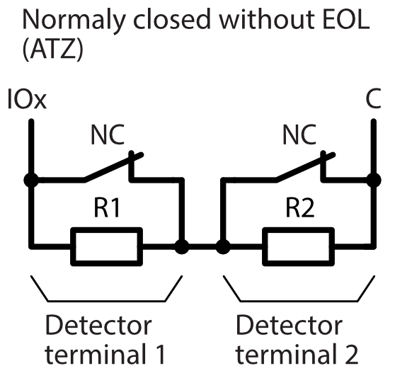 There are 8 terminals IO1–IO8 (inputs) on the iO-8-LORA expander board for connecting sensor circuits. Any terminal can be set as an input and assigned zone attributes: circuit type (NO, NC, EOL, EOL_T, 3EOL, ATZ, ATZ_T); sensitivity to temporary circuit events; zone function (Delay, Instant, Instant Stay, Interior, Interior Stay, Fire, Keyswitch, 24_hour, Silent, Silent 24h).