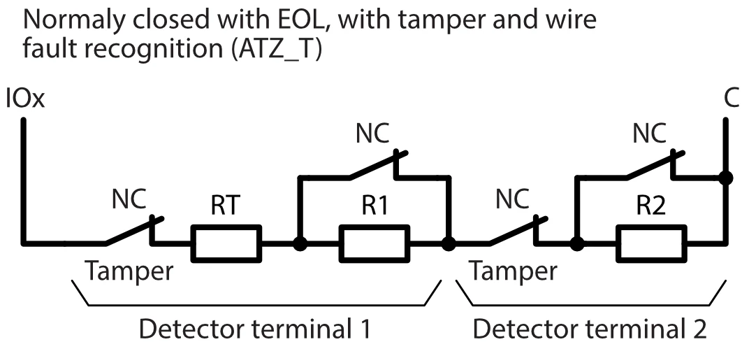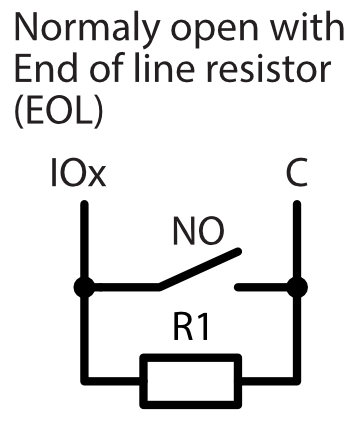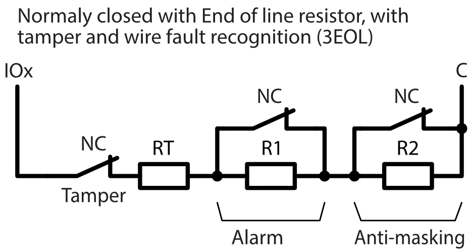 | Dual purpose terminals [I/O] | 8, IN or OUT function selected during programming. When IN is selected, available types: NC, NO, EOL, EOL_T, 3EOL, ATZ, ATZ_T. When OUT is selected, the terminal becomes open collector (OC) type with up to 100 mA current |