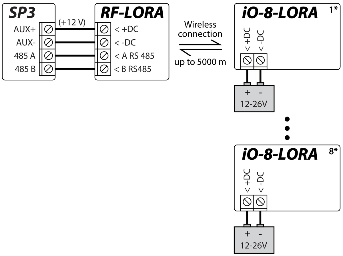 - The iO-8-LORA wireless expander is connected to the "FLEXi" SP3 control panel via the RF-LORA transceiver.