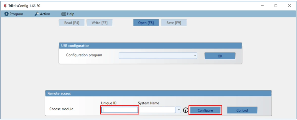- Launch the configuration program TrikdisConfig and in the field “Unique ID” of the “Remote access” section enter the IMEI number of „FLEXi“ SP3. The IMEI number is given on the stickers that can be found on the control panel and on the packaging.