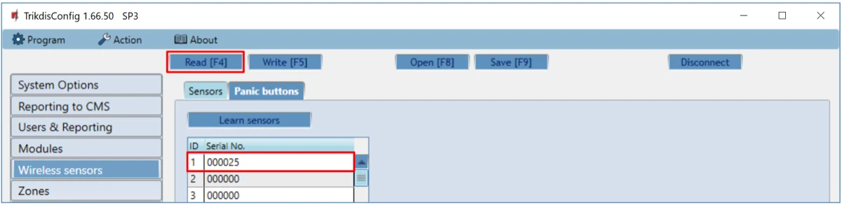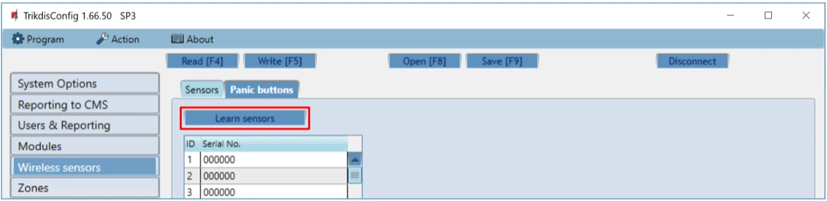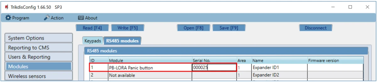 In TrikdisConfig, in the "Wireless sensors" window, enter "0" in the "Serial No." field and press Write [F5]. PB-LORA wireless panic button is deleted from "FLEXi" SP3 memory.