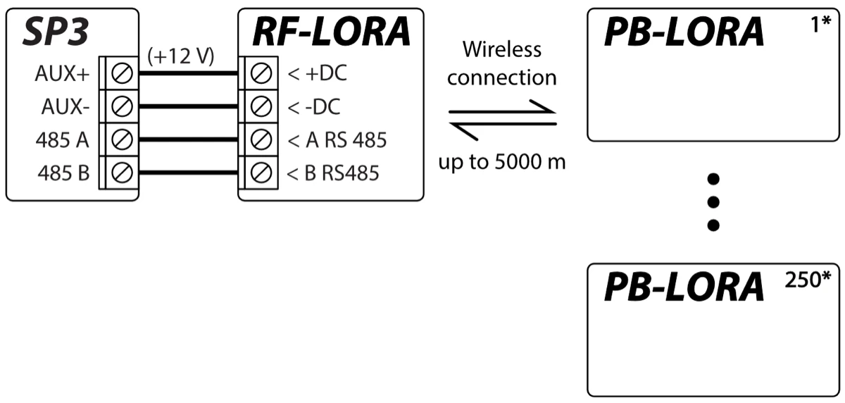 The RF-LORA transceiver must be connected to the "FLEXi" SP3 control panel, and up to 8 PB-LORA wireless panic buttons (control panel firmware version 1.17 or higher. Example: SP3_xxxx_0117.fw) or up to 250 pcs. PB-LORA wireless panic buttons (control panel release 2 firmware with version 1.16 or higher. Example: SP3_xxx2_0116.fw).