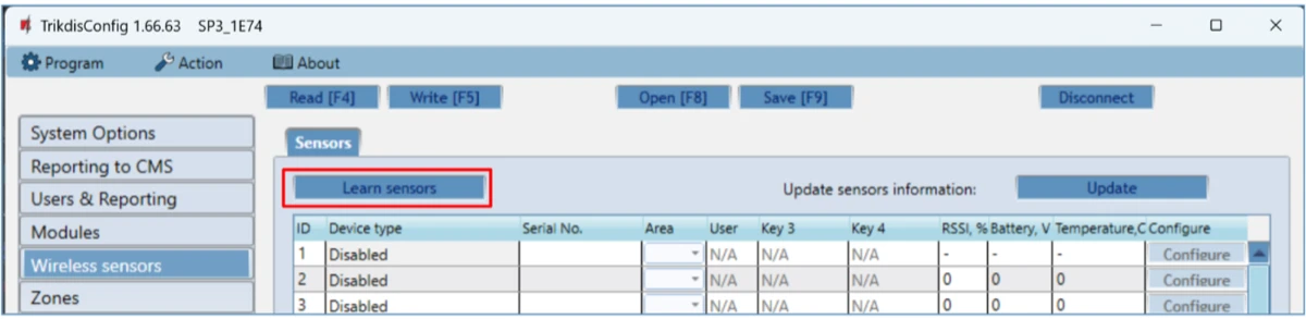 TrikdisConfig window "Wireless sensors" will contain a list of registered wireless devices. In the field "Serial No." will contain the serial numbers of the sensors.