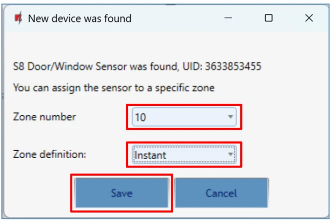 TrikdisConfig will open a new window in which you need to assign a “Zone Number” and “Zone Definition” to the wireless sensor.