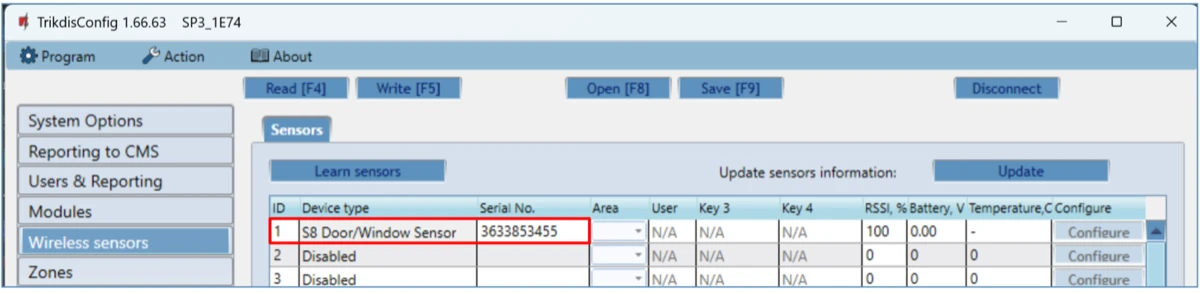 TrikdisConfig will display a list of registered wireless sensors in the “Wireless sensors” window. The “Serial No.” field will list the serial number.