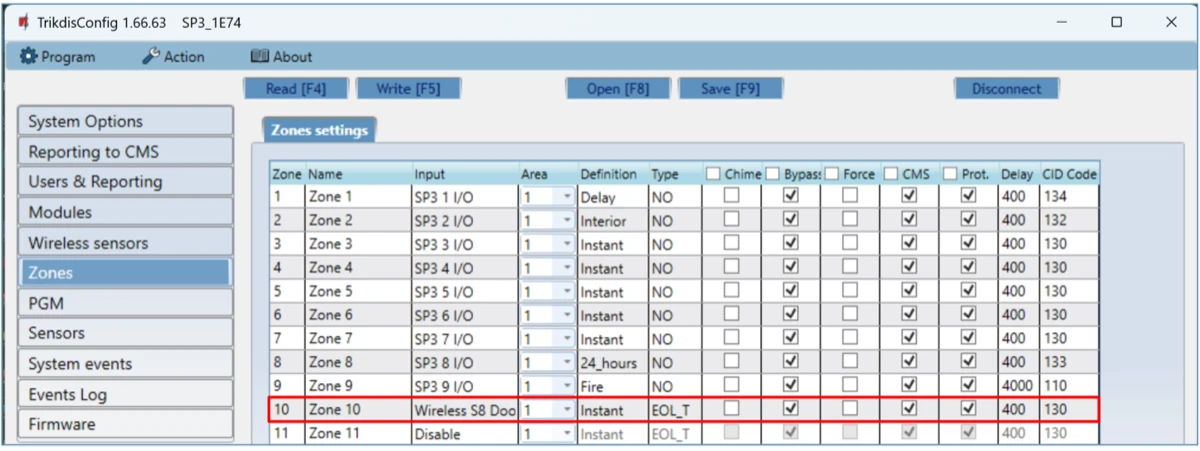 - Check that the sensors are correctly assigned to the “Zones” and “Areas” of the control panel (“Zones” window).