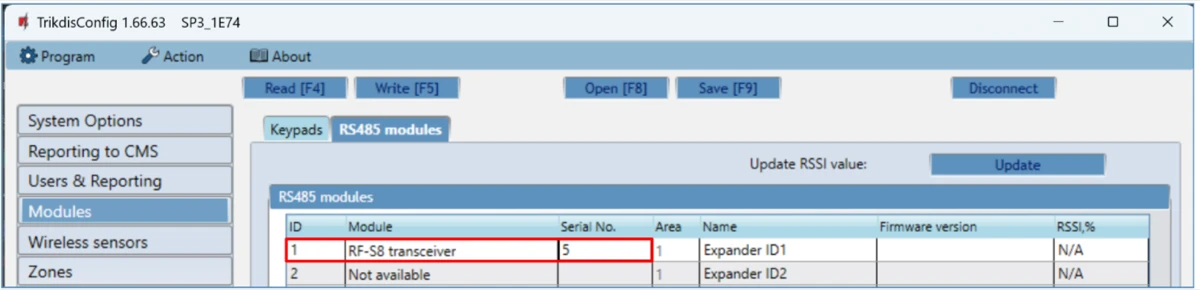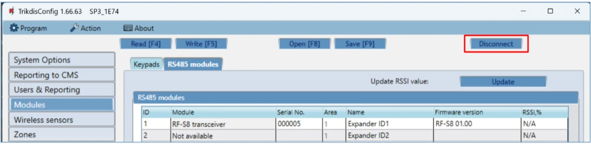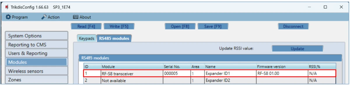 The firmware version of the RF-S8 will appear in the “Modules” window.