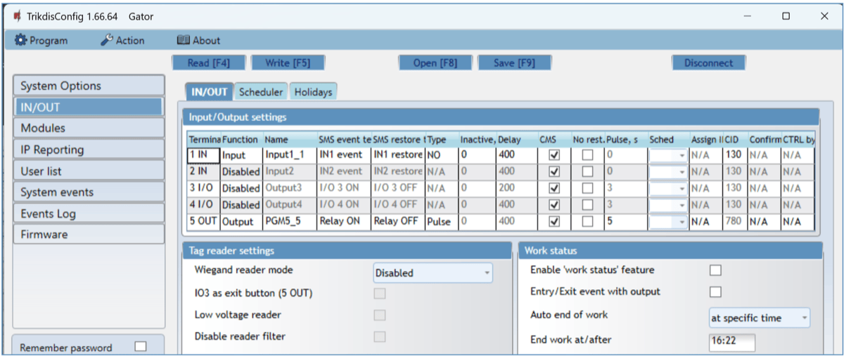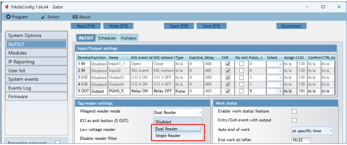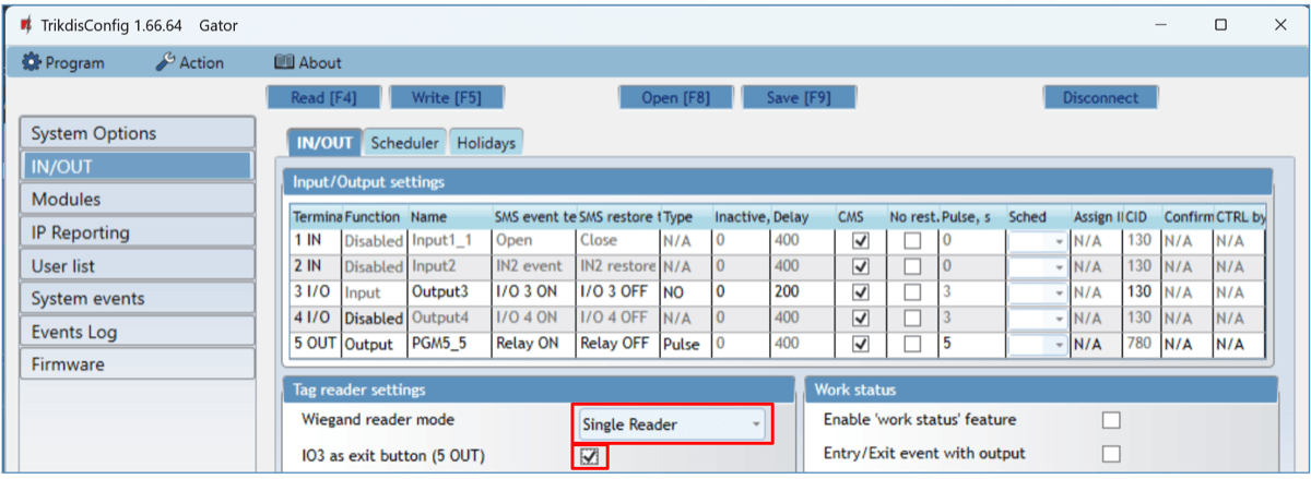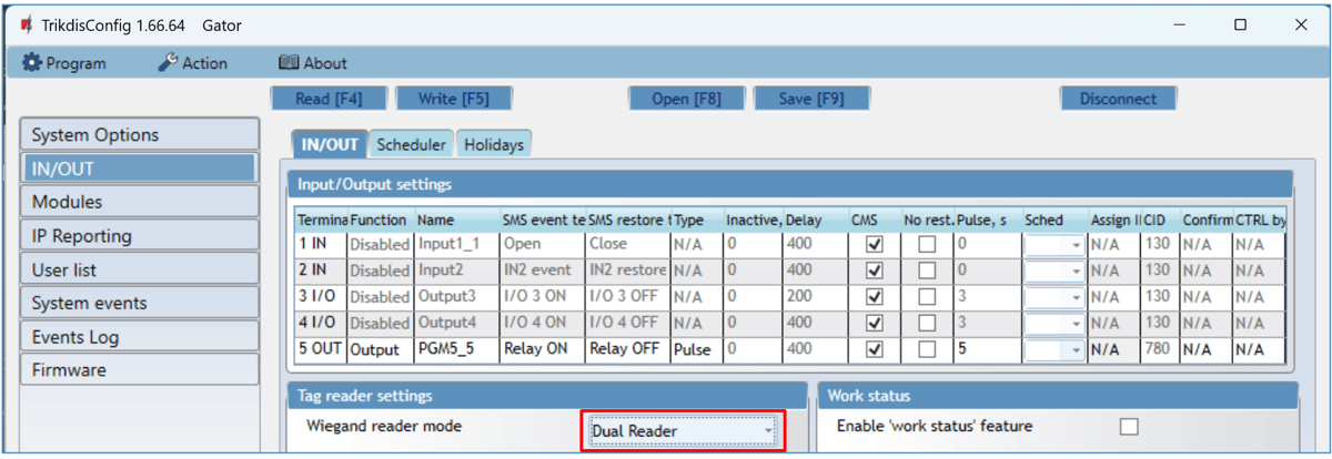 - Connect the RFID reader to the controller (see p.2.6 " Schematic for connecting for RFID reader (Wiegand 26/34)"). Turn on the power to the controller. Connect the USB Mini-B cable to the controller. Specify how many RFID readers are connected in the TrikdisConfig window "IN / OUT".