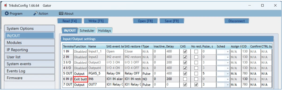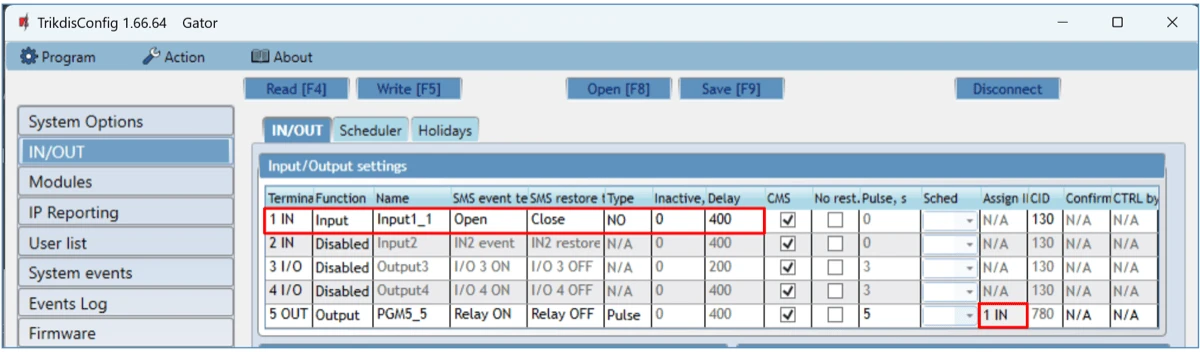 In the TrikdisConfig window “IN/OUT”, assign the connected input to the controller output that will control the gates: