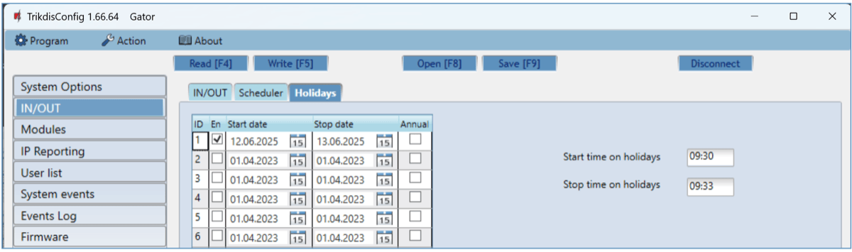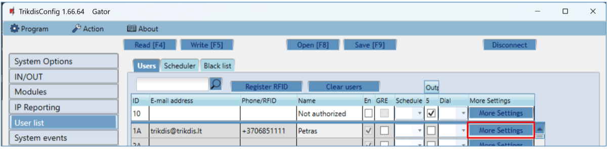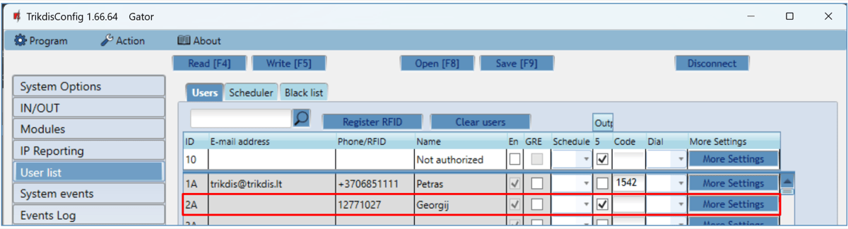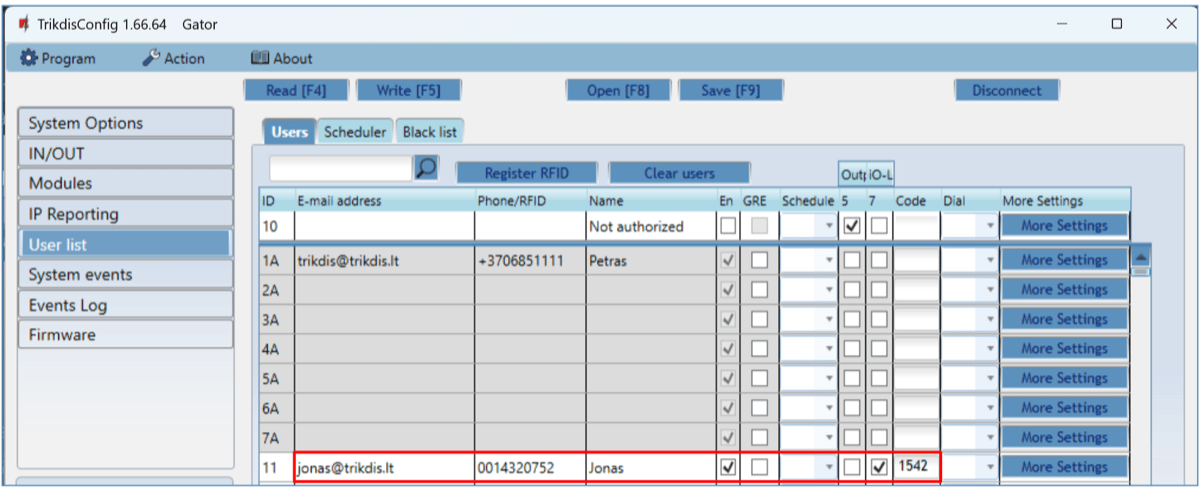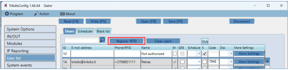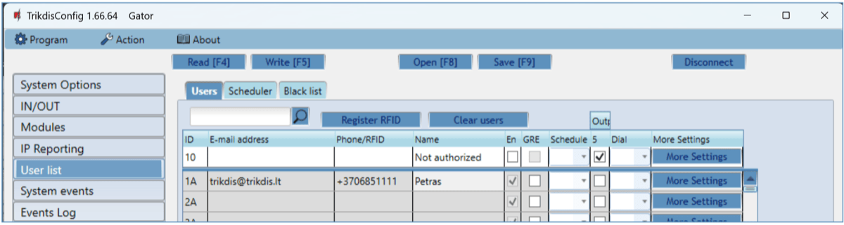 RFID pendants (cards) can be registered in TrikdisConfig by entering their ID numbers in the “Phone/RFID” field. Give the user a Name, check field the “En.” and a managed “Outputs” field. Press the Write [F5] button to save the list of RFID pendants (cards) to the controller.