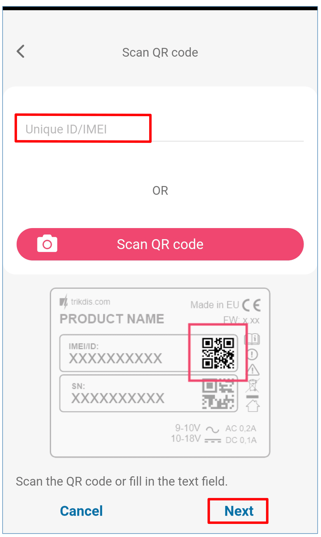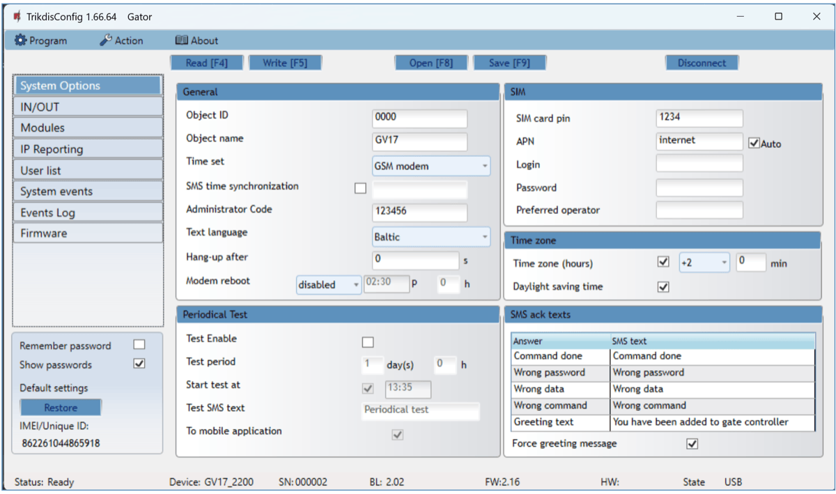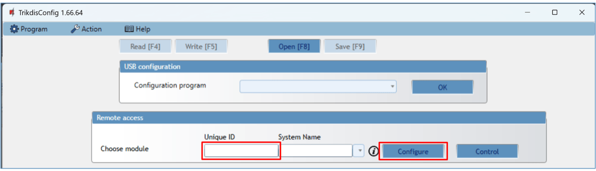 Launch the configuration program TrikdisConfig and in the field “Unique ID” of the “Remote access” section enter the “IMEI/Unique ID” number of your controller (the IMEI number is given on the stickers that can be found on the lower part of the device’s case and on the packaging).