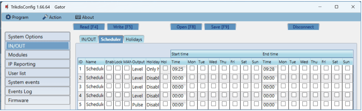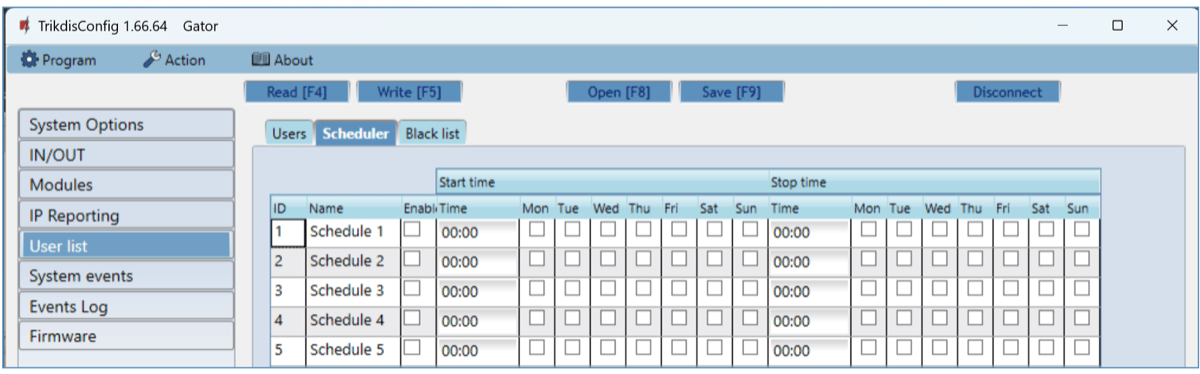 Assign schedule – assign a schedule (specify the required schedules numbers) for when the user can control outputs OUT.