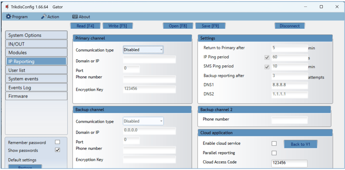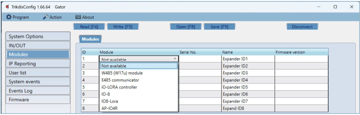 Users can control controller with Protegus2 application, telephone calls and SMS messages. The controller can recognize up to 7 administrator and 1000 user telephone numbers. A user control schedule and counter for how many times a specific user can control the system can be set for the controller. The Cellular controller can send SMS messages informing when inputs and outputs are activated and restored (the text of the SMS messages is customizable). The controller is capable of sending event messages to the receiver of a security company. Connecting a WiFi (W485) or Ethernet (E485) module to the controller can send event messages and control the controller over a wireless or wired internet without using SIM card mobile data. By connecting the RF- LORA transceiver, you can connect the iO8-LORA wireless expander (1 pc.) and iO-LORA wireless expanders (up to 8 pcs.) to the GATOR controller. RFID readers connected to the iO-LORA wireless expansion modules can control up to 8 PGM outputs (GATOR controller program version from 2.13). One iO-LORA expander with an RFID reader controls only one PGM output.