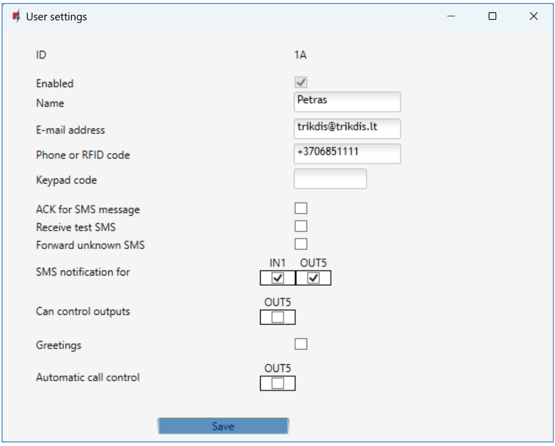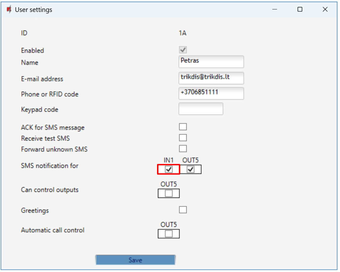 In the “User settings” window, tick the IN1 box if you want the user to receive SMS messages about the state of the gate. Click “Save”.
