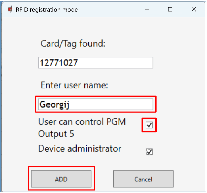 Attach the RFID pendant (card) to the RFID reader. A new window will open when the reader scans the pendant (card). In it, “Enter user name” and select the “User can control PGM Output 5”. Press the “ADD” button. / Repeat the steps above to add more RFID pendant (cards). When the registration of all RFID pendant (cards) is completed, press the “STOP registration” button. / Press the button Write [F5] to save the RFID pendant list to the controller.