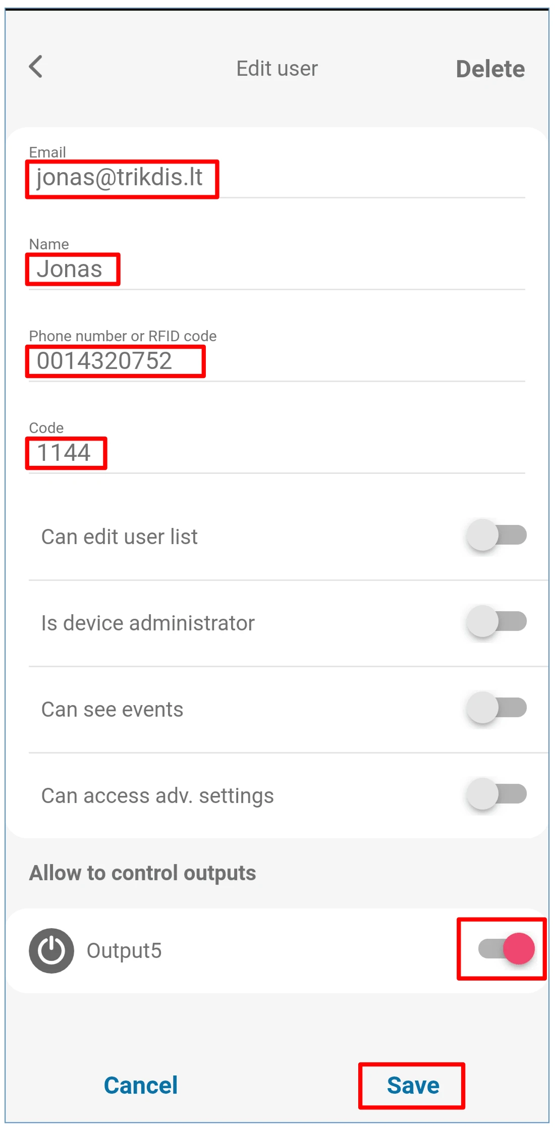 Can control output - mark the output number that will be controlled by the administrator.