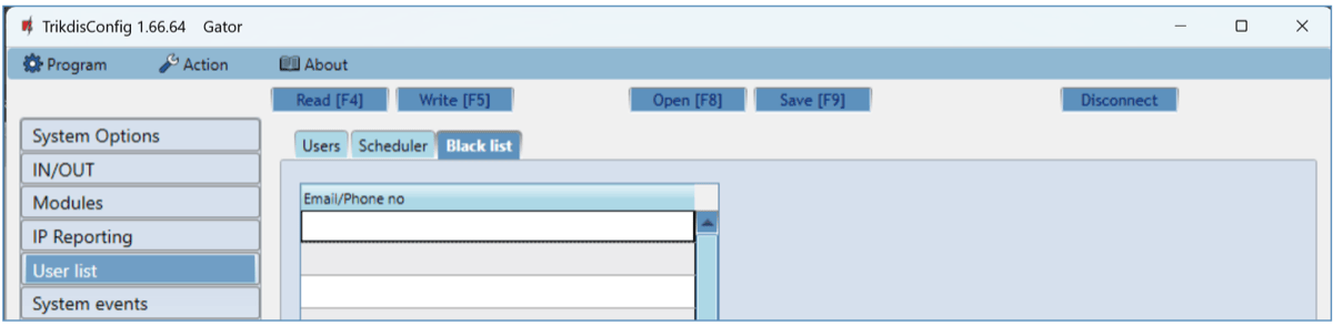 The “Black list” contains e-mail addresses, phone numbers, RFID pendant (card) ID numbers of users who are banned from controlling the controller.