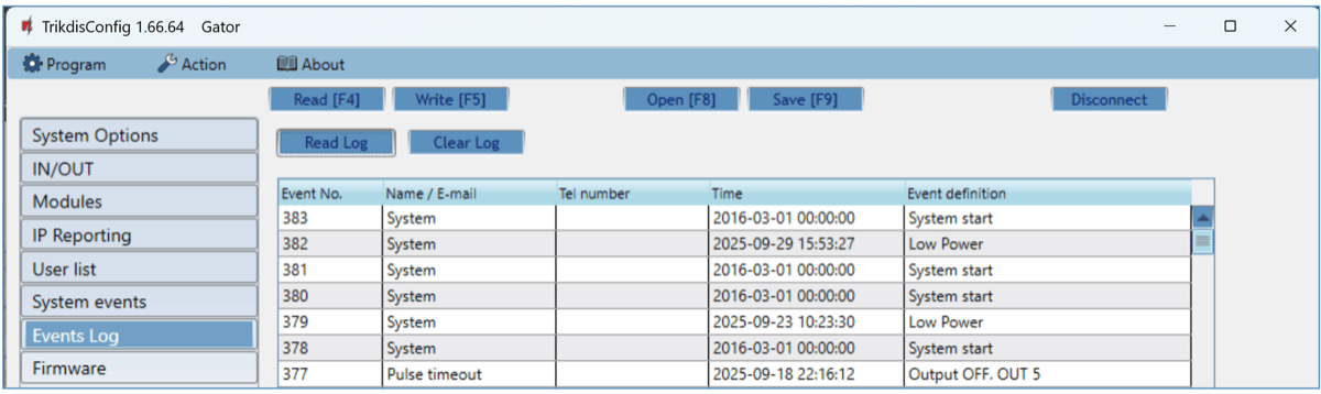 Click the button “Read Log”. The events log will be read from the controller’s memory. The “Events log“ provides information about the controller’s actions and its internal events.