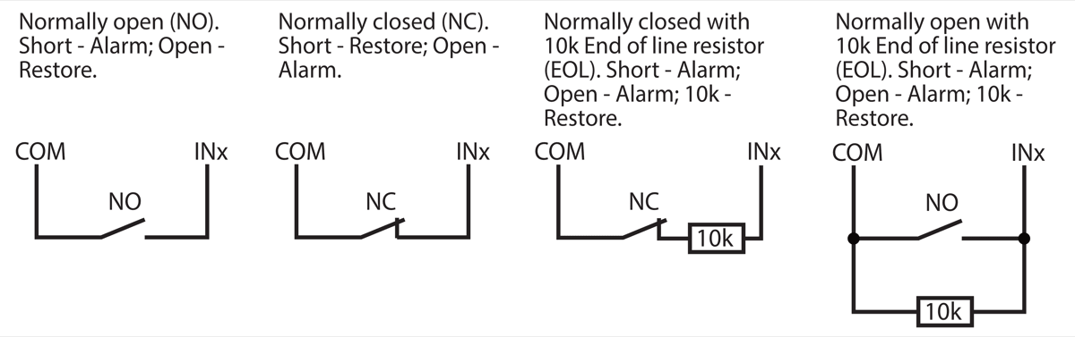 | Inputs | 2, selectable type: NC, NO, EOL=10 kΩ |