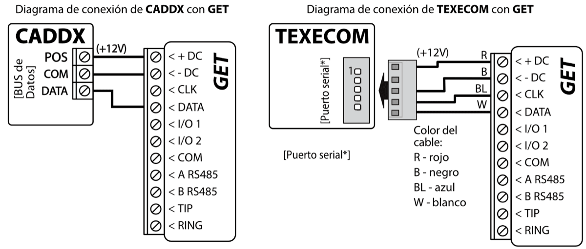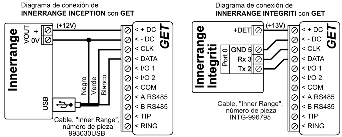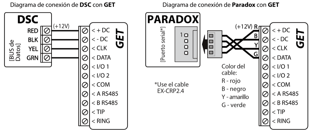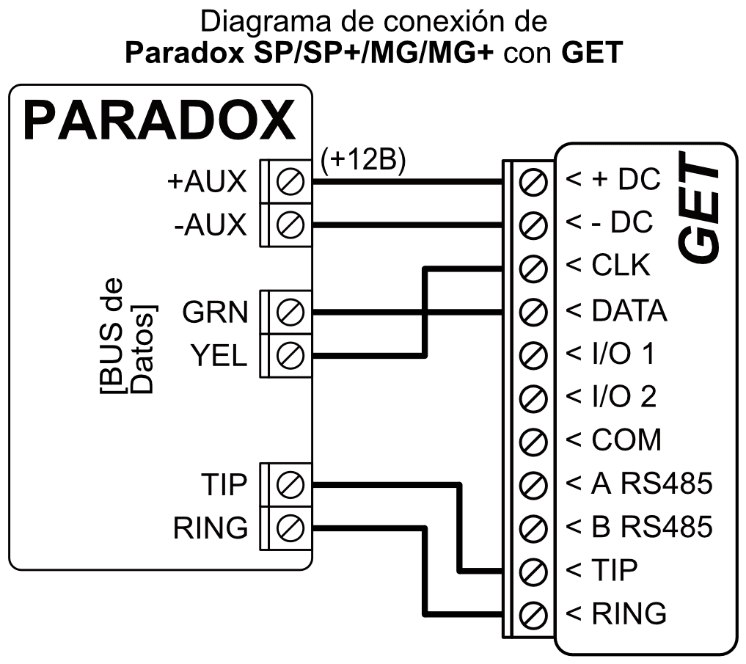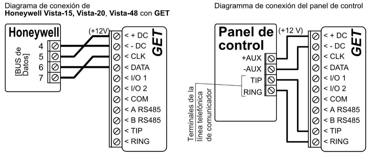 El comunicador celular GET se puede conectar directamente a los paneles de control (DSC, Paradox, UTC Interlogix (CADDX), Texecom, Innerrange, Honeywell) o a un comunicador telefónico (que admite el protocolo de comunicación Contact ID transmitido por tonos DTMF) del panel de control.