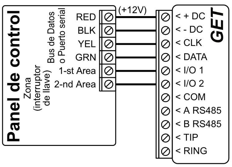 El comunicador GET se puede conectar al bus serie (Serial bus) o al bus de teclado (Keypad bus) o al comunicador telefónico (TIP/RING) del panel de control.