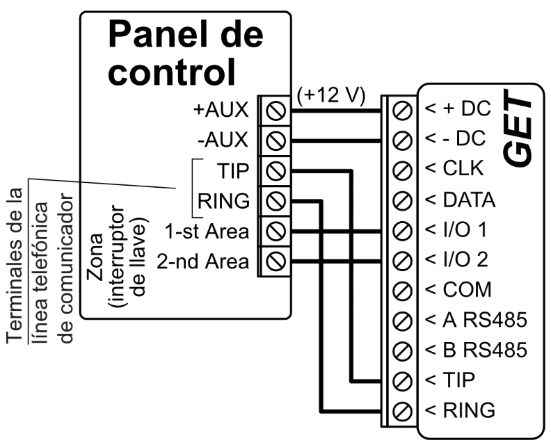 * Los paneles de control de otros fabricantes se conectan al comunicador GET mediante los terminales TIP RING de la línea telefónica del panel de control.
