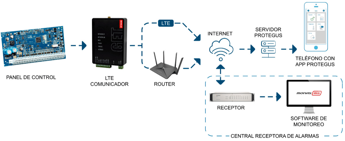 El comunicador está diseñado para transmitir mensajes sobre eventos del panel de control al Centro de Monitoreo y a la aplicación Protegus2.