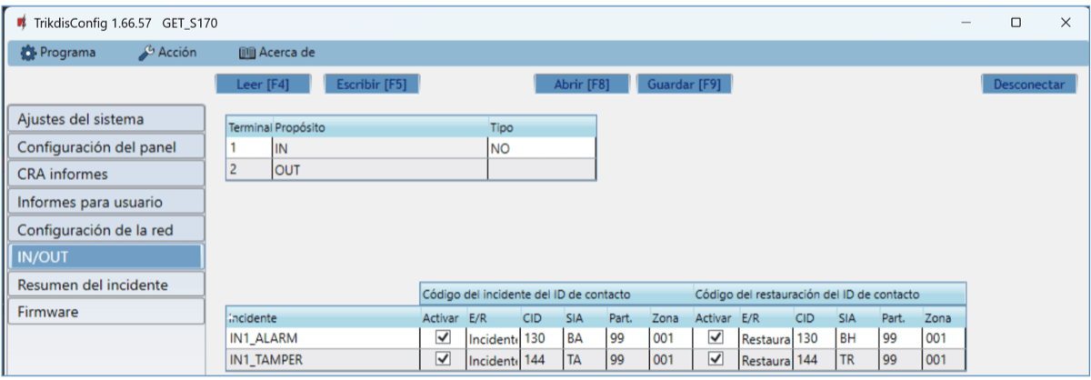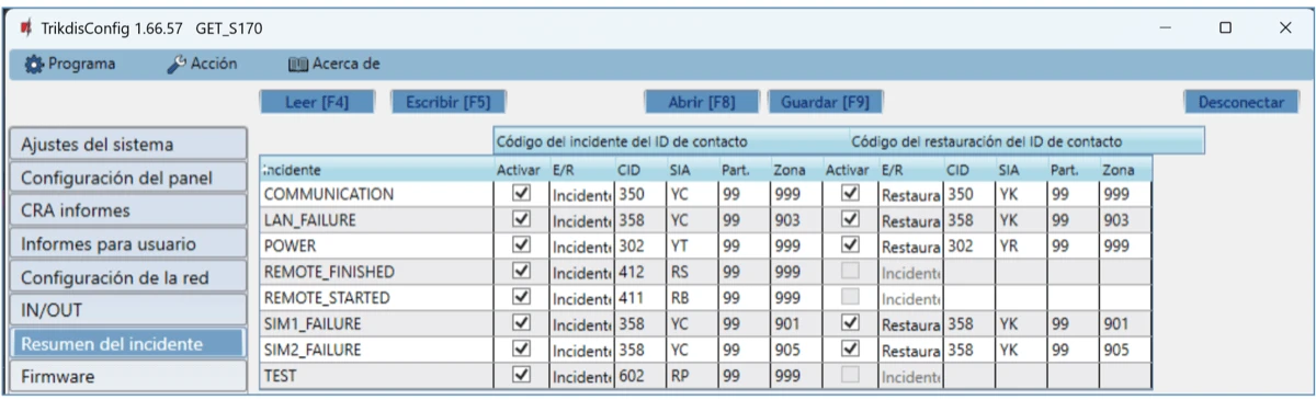Puede enviar información de eventos a SIA DC-09 receptores. El anexo contiene tabla de conversión de los códigos (Contact ID a SIA).