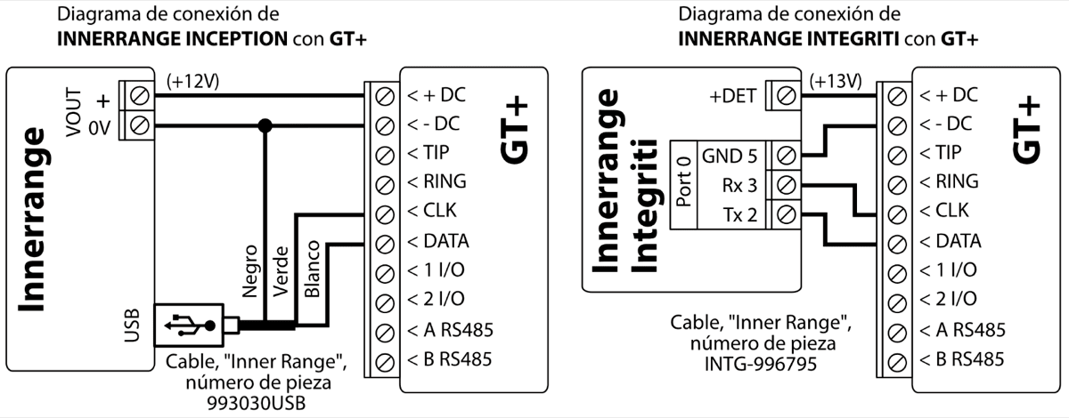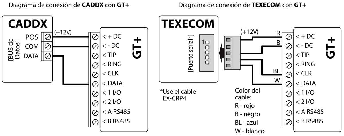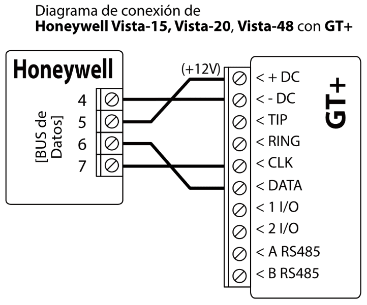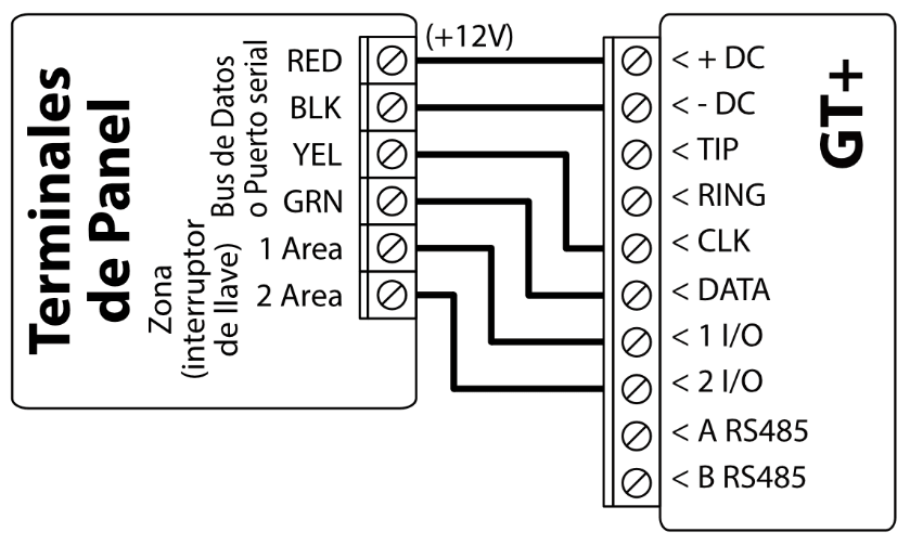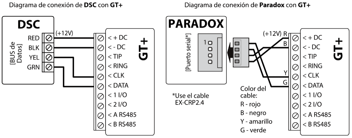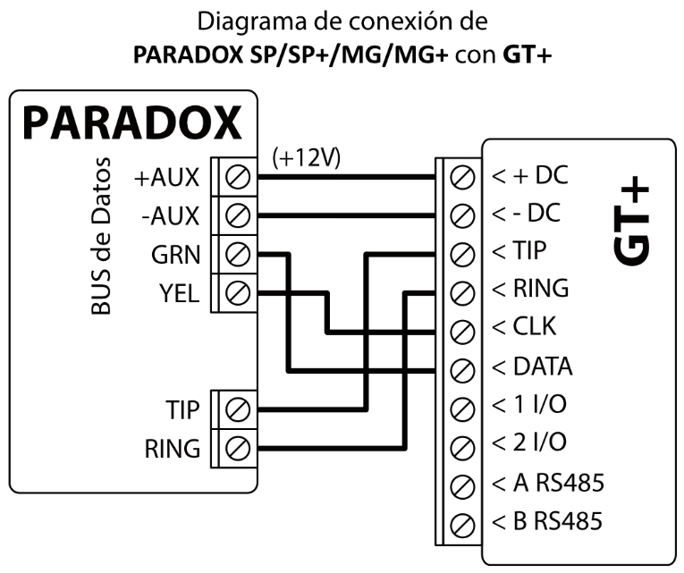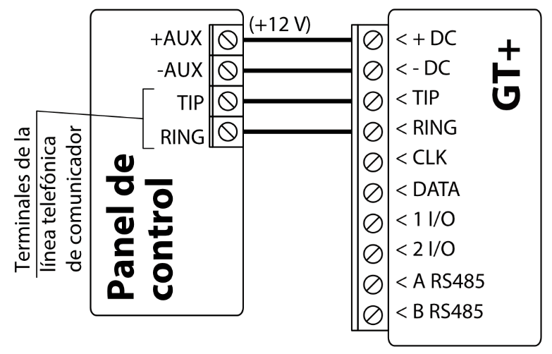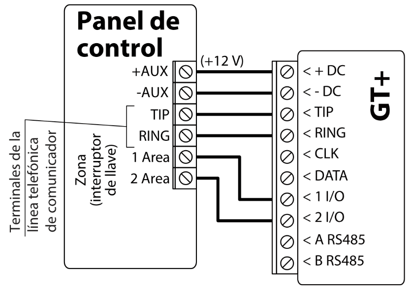 El comunicador celular GT+ se puede conectar directamente a los paneles de control (DSC, Paradox, UTC Interlogix (CADDX), Texecom, Innerrange, Honeywell) o a un comunicador telefónico (que admite el protocolo de comunicación Contact ID transmitido por tonos DTMF) del panel de control.